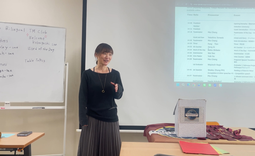・TM WZ, from Pioneer & Tokyo Bilingual Toastmasters Club, delivered a thought-provoking and humorous , titled “Renting a Friend in Tokyo”. In his speech, he shared his experience of renting a Japanese friend in Tokyo for 500 yen per hour. He asked his rented friend a simple yet powerful question: